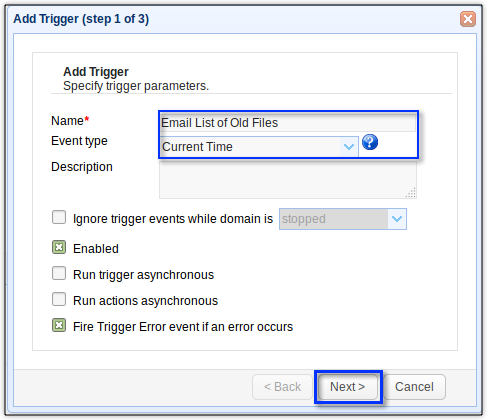Create a new trigger and give that trigger a name (e.g. “List Old Files”). Expand the Event type drop-down list and then select “Directory Monitor File Aged“. This will enable this trigger to listen to the Directory Monitor File Aged event, which will cause this trigger to fire each time an aged file is found. Click Next to proceed.