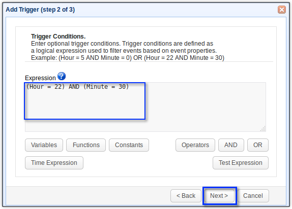 For this example, we would like this trigger to fire an hour after the scan. That should give the server ample time to look for old files in the monitored directory. Since the scan is scheduled to run at 9:30 PM, we’ll let the email sending take place at 10:30 PM. To do that, we simply enter the expression: